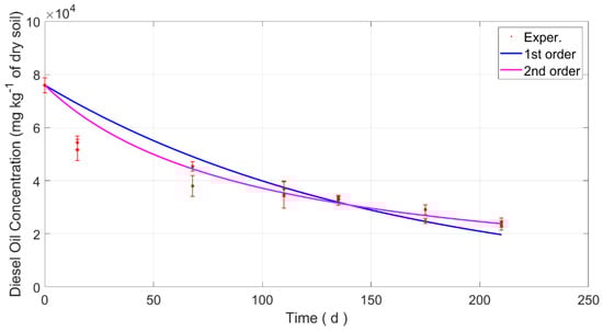 The line modeling the second-order reaction rate is also shown in Figure 9. As for the first-order model, the data fitting was stressed to obtain concentration C = 75926 mg kg−1 of soil at t = 0; as in the previous case, the fitting was performed by the least-square method with uncertain data.