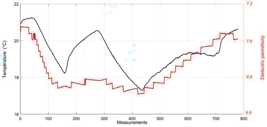 A preliminary test to check the behavior of the relative dielectric permittivity and the temperature is shown in Figure 10. The measurements were collected in a sample of the tested system, i.e., sandy soil, partially saturated with water, diesel oil, and gas. A Water Content Reflectometer (WCR) probe was adopted to measure the dielectric permittivity and the sample temperature. We observed a slight increase in the dielectric permittivity when the temperature increased and vice versa.