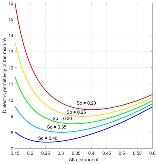Effect of α-exponent of the CRIM formula on relative dielectric permittivity at different diesel oil contents (So), considering a relative water content of 0.4.