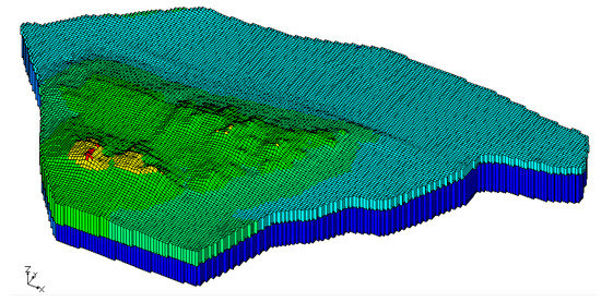 According to the above hydrogeological model, the simulation range, boundary conditions, source and sink terms, and other conditions were determined. The numerical model of groundwater flow field was established using the Modfolw conceptual modeling method. The model was divided into 28,303 effective grids, as shown in Figure 2.