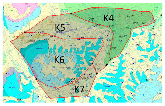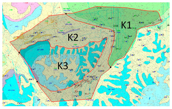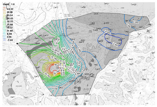 According to the hydrogeological data of the study area, the simulation was divided into two water-bearing rock formations, i.e., the water-bearing rock formation with diving water and water-bearing rock formation with confined water [11,12,13,14,15,16]. The parameter partition of each layer was generalized as shown in Figure 3 and Figure 4. The initial value of hydrogeological parameters of each zone was preliminarily given by borehole pumping tests and other data. In the later stage, the final correction value was determined by checking and adjusting the measured groundwater level of each well point.