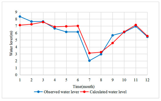 The model identification and verification are important means to check whether the model conforms to the actual hydrogeological conditions. Two independent hydrological years shall be selected for identification and inspection, respectively. The actual measured data of groundwater levels in the research area from January to December in 2016 are selected to identify the model. The model was tested with the measured groundwater level data from January to December in 2017. The calculated flow field and the measured flow field can be basically fitted by correcting the hydrogeological parameters in the study area. The hydrogeological parameters were obtained when the flow field was finally identified and adjusted, which are shown in Table 3.