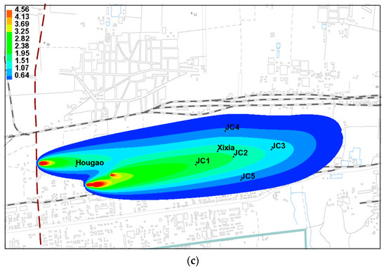 The pollutant transport in the four Hougao wells with strong pumping is shown in Figure 12. The diffusion of ammonia nitrogen pollutant was controlled obviously. The pollution halo of high concentration was basically controlled in the vicinity of the strong pumping well, and does not continue to spread outwards. However, the super standard contaminant with lower concentrations was still far away. The influence distance reaches 3.28 km at the end of 20 years, endangering the water supply security of the Xixiazhuang area. Therefore, after taking strong pumping measures in the four Hougao wells, there was still a wide range of contaminant exceeding the standard, and further control measures are needed to control the spread of pollution exceeding standard.