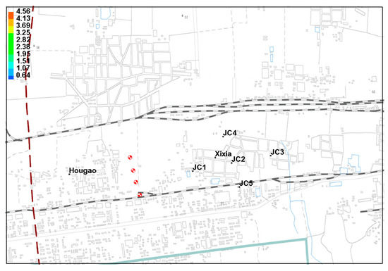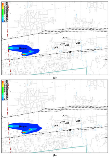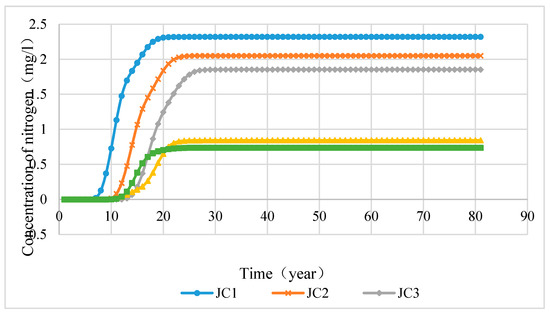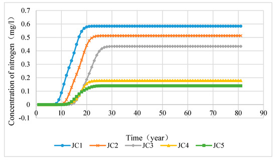 At the same time, five monitoring wells (JC1–JC5) in the Xixiazhuang area were selected to observe the difference of spatial distribution of pollutants. The concentration changing curve is drawn according to the concentration monitoring data of the monitoring well, as shown in Figure 11. It can be seen from the change curve of ammonia nitrogen concentration in the monitoring wells that the ammonia nitrogen concentration in each monitoring well presents a trend from rising to stable. In the process of ammonia nitrogen migration, the concentration of ammonia nitrogen in the monitoring wells will rise due to the concentration of ammonia nitrogen in the monitoring wells. With the further expansion of the ammonia nitrogen diffusion range, the concentration of ammonia nitrogen in the monitoring wells will gradually stabilize. At the same time, by comparing the concentration curves of each monitoring well, it can be found that the closer the monitoring well to four Hougao wells source pollution, the faster the ammonia nitrogen concentration reaches the peak. Monitoring well JC1 reaches the peak of 2.32 mg/L in 29 years; JC2 2.05 mg/L in 32 years; and JC3 reaches the peak of 1.85 mg/L in 35 years. By comparing the peak concentration of monitoring wells, it can be found that the closer the monitoring wells to the pollution source, the higher the peak concentration. By comparing the concentration curves of JC2, JC4, and JC5, it can be found that the closer the area to the pollution halo center, the higher the pollutant concentration. The pollutant concentration decreases from pollution halo center to both sides. From the concentration curve, it can be seen that the concentration of ammonia nitrogen pollutants in the Xixia area is relatively high, reaching a maximum of 2.32 mg/L. The concentration is 4–5 times above class Ⅲ water standard. The ammonia nitrogen concentration of JC4 and JC5 monitoring wells with smaller concentration also reach 0.84 mg/L and 0.74 mg/L, and all exceed the 0.5 mg/L stipulated in the class Ⅲ of the groundwater standard. Therefore, in the absence of preventive and control measures, ammonia nitrogen pollutants will continue to maintain a relatively high concentration, endangering the water security in the eastern region.