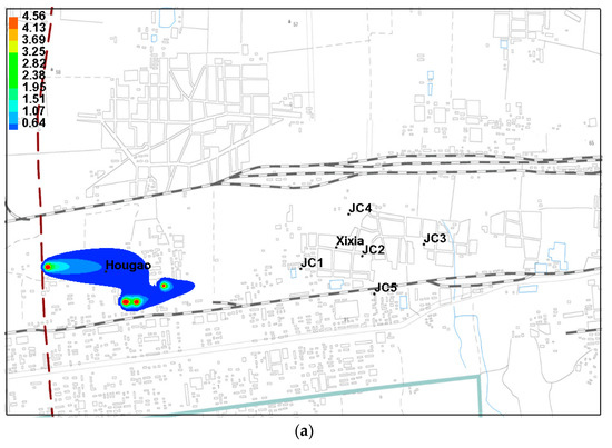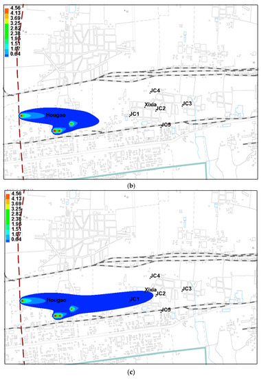 There are many types of groundwater pollutants in the Hougao area. Among them, ammonia nitrogen, chloride, petroleum, and benzene exceed the standard most seriously. The ammonia nitrogen is used as the control index of domestic and industrial waste water in the policy documents of pollution emission. It can show the specific situation of industrial waste water and domestic waste water pollution changing with time. Thus, ammonia nitrogen was selected as the pollution factor in this simulation. According to the latest detected concentration of ammonia nitrogen pollutants of the four Hougao wells in May 2017, the concentration of ammonia nitrogen was 10.02 mg/L in Hougao well 1#, 11.38 mg/L in Hougao well 2#, 13.13 mg/L in Hougao well 3#, and 6.4 mg/L in Hougao well 4#, which were used as the initial concentrations of the ammonia pollution simulation. According to the class Ⅲ standard of the groundwater environmental quality standard of GB/T 14848-2017, the standard limit concentration of ammonia nitrogen is 0.5 mg/L. The maximum influence range of the standard limit concentration is taken as the pollution exceeding limit range [12,13,14,15]. Since the pollutant concentration of the four Hougao wells is high all year round, the pollutant release condition is set as the continuous release condition.
