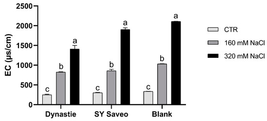 Electrical conductivity (EC) of the soils at the end of the experiments. Data are expressed as means ± standard error (SE, n = 3). Post hoc comparisons conducted with the Tukey–Kramer method. Means with different letters are statistically different (p ≤ 0.05) within the same group.