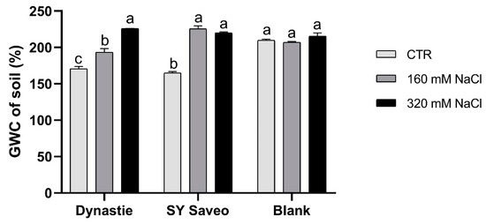 Gravimetric water content (GWC) of the soils at the end of experiments. Data are expressed as means ± SE (n = 3). Post hoc comparisons conducted with the Tukey—Kramer method. Means with different letters are statistically different (p ≤ 0.05) within the same group.