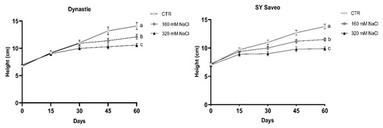 Effects of salt on the height of the cultivars. Data are expressed as means ± SE (n ≥ 8). Post hoc comparisons conducted with the Mann–Whitney pairwise comparison test. Means with different letters are statistically different (p ≤ 0.05) within the same cultivar. All values with post hoc comparisons are shown in the Supplementary Materials, Table S1.