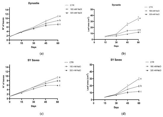 Number of leaves and leaf area in Dynastie (a,b) and SY Saveo (c,d). Post hoc comparisons conducted with the Mann–Whitney pairwise comparison test. Data are expressed as means ± SE (n ≥ 8). Means with different letters are statistically different (p ≤ 0.05) within the same cultivar. All leaf area values with post hoc comparisons are shown in the Supplementary Materials, Table S2.