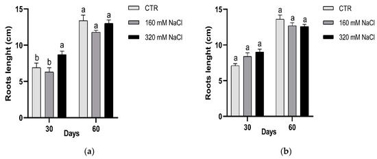 Effect of salt on the root growth: Dynastie (a) and SY Saveo (b). Data are expressed as means ± SE (n ≥ 8). Post hoc comparisons conducted with the Tukey–Kramer method. Means with different letters are statistically different (p ≤ 0.05) within the same period and cultivar.