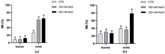 Membrane injury index of leaves and roots of Dynastie (a) and SY Saveo (b), determined at the end of the experiment. Data are expressed as means ± SE (n = 3). Post hoc comparisons conducted with the Tukey–Kramer method. Means with different letters are statistically different (p ≤ 0.05) within the same organ of the cultivar.