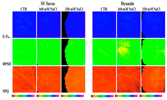 Chlorophyll fluorescence images of photochemistry (Fv/Fm) in a dark-adapted leaf and PSII photochemistry (ΦPSII) and non-photochemical quenching (NPQ) at steady-state with actinic illumination of 55 µmol photons m−2 s−1 measured at the end of the experiment (60th day) in two cultivars of Brassica napus (Saveo and Dynastie) exposed to different NaCl treatments (CTR, 160 mM NaCl, 320 mM NaCl). The false color code depicted at the bottom of the images ranges from 0.00 (black) to 1.00 (pink).