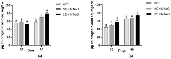 Amounts of phenolic compounds after 30 and 60 days of treatment: Dynastie (a) and SY Saveo (b). Data are expressed as means ± SE (n = 3). Post hoc comparisons conducted with the Tukey–Kramer method. Means with different letters are statistically different (p ≤ 0.05) within the same period and cultivar.