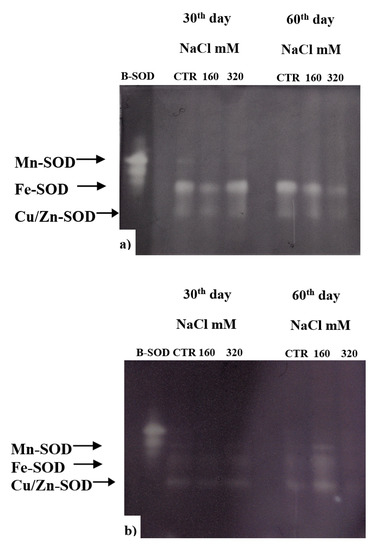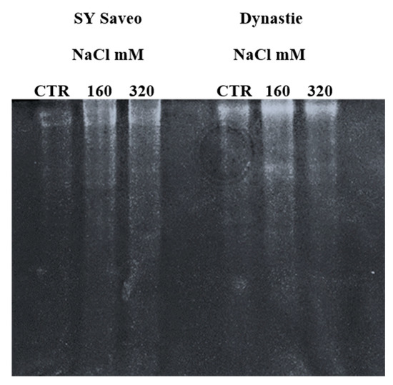 A critical role in the survival of plants under stressful environment has been ascribed to the activity of SOD, which upregulation can counteract the oxidative stress. In our experiment, after 60 days of treatment, SOD of both cultivars resulted to be less active in the plants treated with 320 mM NaCl compared to control and to 160 mM NaCl; while at 30 days the activity in SY Saveo was lower than that observed in Dynastie for both treated and control plants (Figure 10). These data suggest a different behaviour of SOD in the two genotypes.