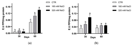 PPO activity after 30 and 60 days of treatment: Dynastie (a) and SY Saveo (b). Data are expressed as means ± SE (n = 3). Post hoc comparisons conducted with the Tukey–Kramer method. Means with different letters are statistically different (p ≤ 0.05) within the same period and cultivar.