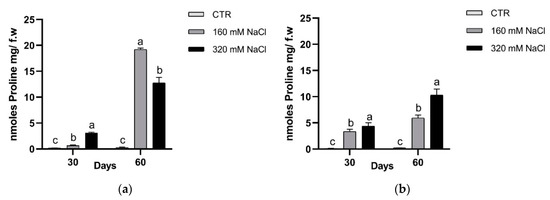 Proline concentration after 30 and 60 days of treatment: Dynastie (a) and SY Saveo (b). Data are expressed as means ± SE (n = 3). Post hoc comparisons conducted with the Tukey–Kramer method. Means with different letters are statistically different (p ≤ 0.05) within the same period.