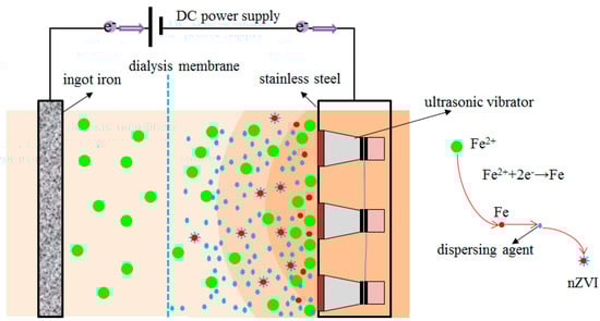 FeSO4·7H2O was dissolved in deionized water to prepare an electrolyte with Fe2+ of 30 g/L. The additive (thiourea, 0.5 g/L and DBS, 1.0 g/L) was dispersed and emulsified in deionized water in an ultrasonic cleaner (VGT SONIC-L30 300 w, 28 kHz) and added to the electrolyte. The electrolysis was carried out at 50~60 °C and the anode plate for electrolysis was a waste carbon steel (Q235) plate, which was used after surface treated. The cathode plate for electrolysis was a stainless-steel box and several ultrasonic vibrators were added in the box. The ultrasonic power was 28 KHz. The cathode and the anode were separated by a filter membrane and the structure of the electrolytic cell is shown in Figure 1. After 10 h of electrolysis, the electrolyte near the cathode plate was rapidly pumped out and filtration, and the leached residue was washed with deionized water and absolute ethanol for three times, respectively. Subsequently, DBS and absolute ethanol were intermixed with leached residue and dispersed in a mechanical disperser (FS400D, 2000 rpm, Qiwei instrument Co. Ltd., Hangzhou, China). Finally, an emulsion of nZVI was prepared after 12 h of dispersion under nitrogen protective.
