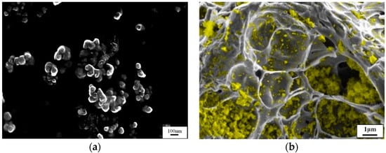 Many methods such as adsorption [], reduction [], advanced oxidation processes [], coagulation [], membrane separation [], and biological methods [] are used to remove dyes from wastewater. In recent years, nanoscale zero-valent iron (nZVI) particle has been extensively used as a new tool for the treatment of wastewater contaminated with various pollutants as a result of its small particle size, large specific surface area, and high reactivity []. Unfortunately, there are still some technical challenges in the use of nZVI. On the one hand, because of interparticle Van der Waals and magnetic interactions, nZVI particles are prone to agglomeration, resulting in the significant decrease of their dispersibility []. On the other hand, nanoparticles tend to be oxidized, and the formation of oxide layers easily block the serviceable active surface sites, which finally diminishes the reactivity []. To get rid of these shortcomings, supporting nZVI particles is an option. For the past few years, most of previous studies have loaded nZVI particles on some porous materials as a carrier, such as kaolinite [], bentonite [], resin [], activated carbon [], mesoporous carbon [], mesoporous silica [], titanium oxide [], pumice [,], and grapheme [], through the liquid phase reduction method. Nevertheless, there still has some problems associated with method, such as low production efficiency, high production cost, and large amounts of hydrogen the generation during the preparation process [,]. All of these problems lead to the limitations of large-scale application.