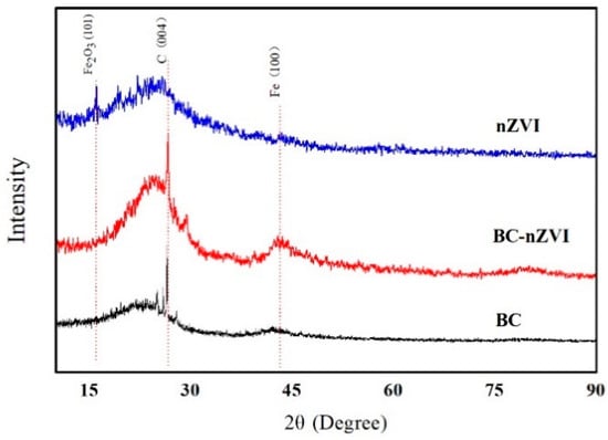 XRD pattern of nZVI, BC, and BC-nZVI.