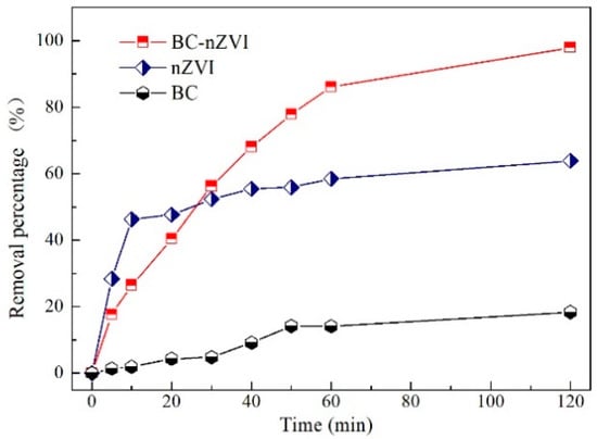 The removal percentage of MO was investigated using BC, nZVI, and BC-nZVI, respectively, as shown in Figure 4. Obviously, the total removal percentage of BC-nZVI and nZVI are significantly higher than that of BC as a result of the contribution of nZVI. But for nZVI and BC-nZVI, the different tendencies were presented. In the early stage (within 20 min), nZVI holds the higher removal percentage than that of BC-nZVI. The reason behind this fact is that the nZVI was in direct contact with the aqueous solution and the reaction was fast, while the removal percentage of BC-nZVI is lower because the pore structure of BC prevents the contact bewteen nZVI and MO. However, the opposite results can be found after 20 min, and the BC-nZVI shows the higher removal percentage than that of nZVI. This is due to the fact that the sole nZVI particle was easily oxidized than BC-nZVI composite material, resulting in the decreased reaction activity.
