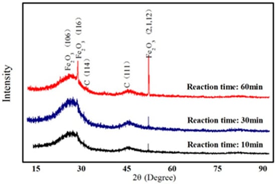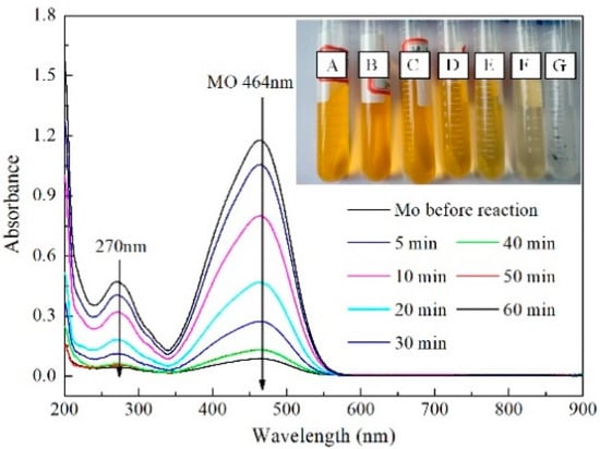 Figure 5 showed the UV–vis absorption spectra of the MO before and after the addition of BC-nZVI. For the original MO, there were two main absorption bands at 464 and 270 nm, which were attributed to a conjugate structure formed by the azo band under the effects of the electronic-donation of dimethylamino group and the π–π * transition of aromatic rings []. Obviously, the band intensity of 464 and 270 nm decreased with reaction time, and almost disappeared after reaction 50 min. It proves the degradation of MO through the cracking of azo bonds. The XRD pattern of BC-nZVI after interaction with MO was represented in Figure 6. The characteristic peaks of 27.87°, 50.17° present the iron (III) oxide Fe2O3. With the increase of reaction time, the intensity of Fe2O3 characteristic peaks increased. The radicals of H were generated by the reaction nZVI nanoparticles and H2O or hydrogen ion [,], which caused the azo bond to open and consequently the absorption bands at 464 nm and 270 nm vanished.