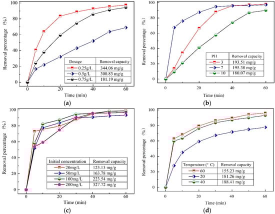 (a) Effect of dosage on degradation of MO, with an initial MO concentration of 200 mg/L, temperature of 25 °C, and original pH; (b) Effect of the pH values on degradation of MO, in the context of 0.5 g/L BC-nZVI with an initial MO concentration of 50 mg/L; (c) Effect of initial concentration on degradation of MO, at the original pH using 0.5 g/L BC-nZVI; (d) Effect of temperature on degradation of MO, in the context of 0.5 g/L BC-nZVI with an initial MO concentration of 50 mg/L, temperature of 25 °C, and the original pH.