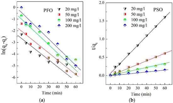 In order to investigate the mechanism of degradation, the pseudo-first-order kinetics model (PFO) (Equation (5)) and the pseudo-second-order model (PSO) (Equation (6)) were generally used to test the degradation of MO using BC-nZVI, which can be expressed as the following equation [,]: