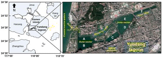 Location of the study area (Xiamen Island, Southeast China) and sampling sites (sites A–F) in the Yundang Lagoon. A schematic representation of water circulation in the Yundang Lagoon is given in [].