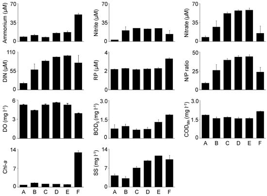 Mean value (n = 3; ±SE standard error) of near-bottom water variables at each site: ammonium, nitrate, nitrite, dissolved inorganic nitrogen (DIN = ammonium, nitrate, and nitrite), reactive phosphorous (RP), N/P, dissolved oxygen (DO), biological oxygen demand (BOD5), chemical oxygen demand (CODMn), chlorophyll-a (Chl-a), and suspended solids (SS).