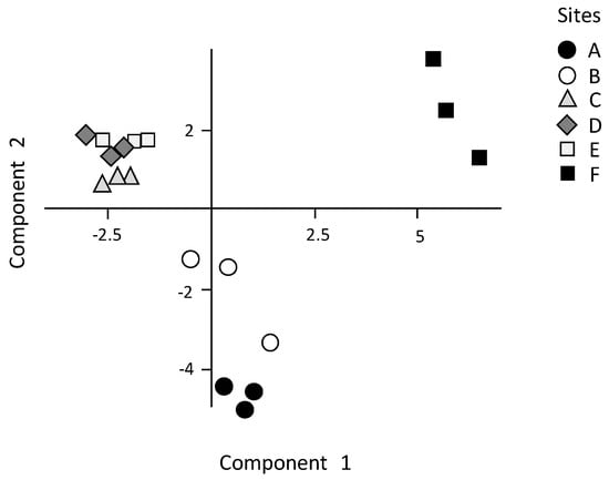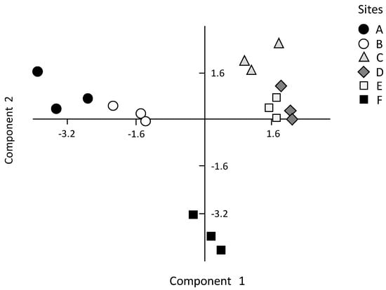 Near-bottom water temperature and salinity were homogeneous throughout the lagoon averaging 22.6 ± 0.2 °C and 29.9 ± 0.3 psu (± SE standard error), respectively. Marked spatial variation was found for all the other environmental variables examined (Figure 2). In particular, ammonium, RP, BOD5, CODMn, and Chl-a concentrations were highest at site F, while nitrate, nitrite and DIN concentrations, and the N/P ratio were lowest at site A. SS concentrations were lowest at both site A and B. Overall, the water variables highlighted the hypertrophic condition of site F, in the innermost sector of the lagoon, as compared to all the other sites. Separation of sites was also clearly revealed by PCA, as site F was separate along the x-axis, and sites A and B along the y-axis (Figure 3). The PCA loadings showed the highest correlation for ammonium, RP, BOD5, CODMn, and Chl-a (positive), and DO (negative) on the x-axis, and the highest (positive) correlation for nitrate, nitrite DIN, N/P, and SS on the y-axis (Table 2).