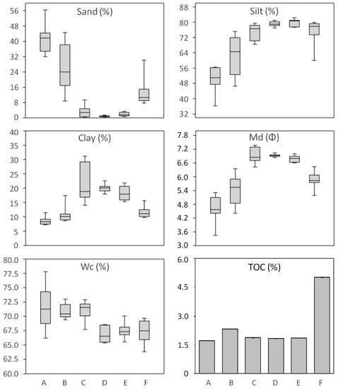 Samples were collected on November 13–14, 2012 at six different sites (A–F) hundreds of meters apart and covering different sectors of the lagoon (Figure 1). Site selection was based on our extensive knowledge of the lagoon’s general features [,,]. All sites were characterized by unvegetated soft-bottom sediments with a depth varying from about 1.5–3 meters. At each site, three stations tens of meters apart were randomly chosen and three replicate sediment samples meters apart were collected at each station using a Van Veen grab (30 × 20 cm, penetration depth 18 cm, approximate volume of 7 L), for a total of 54 samples. Each sediment sample was sieved on a mesh size of 0.5 mm and the residue was fixed in a 5% formalin buffered solution for macrozoobenthos determination. Prior to sieving, a subsample of the top 1 cm of the sediment was collected from each grab to determine water content and grain-size and chemical (total organic carbon and total nitrogen) analysis. These subsamples were kept refrigerated in a cooler-box until further treatment in the laboratory.