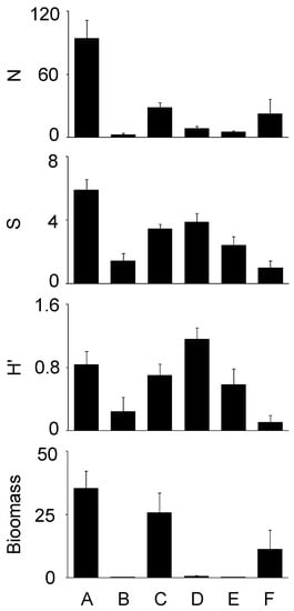 Mean values (n = 9; ±SE standard error) of the total number of individuals (N, ind. 600 cm−2), total number of species (S), Shannon index (H’), and biomass (g.wet weight 600 cm−2) at each site.