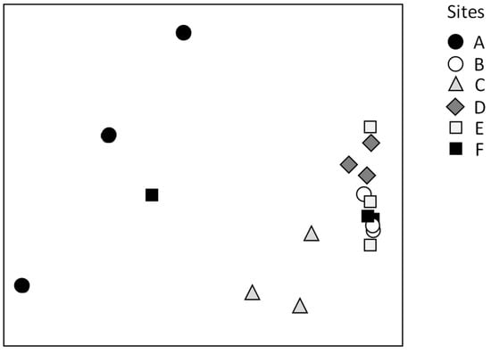 The separation of sites based on the macrobenthos structure was revealed by the MDS (Figure 8). The low level of stress (=0.05) confirmed that there was a good representation of the community pattern. Site A was most markedly distinguished from all the other sites, with the exception of one station of site F dominated by M. sallei, while both sites A and C were clearly separated from the other sites. The significance of differences among the sites was confirmed by the PERMANOVA (Table 5). Canonical correspondence analysis (CCA) revealed the relationship between the selected environmental variables and the ordination model produced (Figure 9). The first two axes accounted for 69.1% of the explained variability (51.5% and 17.6% for the x- and y-axes, respectively). The environmental variables were plotted as correlations with site scores and the strongest correlations were found for sand (negative) and for SS, Md, nitrate, and RP (positive); TOC was less correlated with the axes. Overall, the environmental variables mostly affecting the separation of sites were those connected with the trophic and hydrodynamic features of the inner lagoon sites (D, E), with sand vs. Md and SS in opposite directions to indicate, as proxies, higher and lower hydrodynamics, respectively (Figure 9).