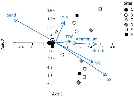Surface sediments were generally muddy, with a prevalence of silt at all sites (Figure 4). However, spatial differences included higher sand content at sites A and B, compared to C, D, and E (Figure 4). The median particle diameter (Md) varied similarly to the variation in the silt content among sites, with the highest Md values at sites C, D, and E. The water content (Wc) varied less markedly among sites, with the largest within−site variation at site A. Finally, the TOC content did not show marked differences among sites, except at site F. In particular, TOC varied from 1.7% to 2.3% at sites A and B, respectively, but was up to 5.0 ± 0.01 at site F, providing an additional evidence of its hypertrophic condition (Figure 4). Similar to the water variables, the ordination model of the PCA carried out on the sediment variables revealed a clear separation of site F along the y-axis (Figure 5). Along the x-axis, sites A and B were located on the negative pole, opposite to sites C, D, and E. The observed pattern is consistent with the variation in sediment grain-size among sites A–E, with higher loadings for sand (negative values) and silt, clay and Md (positive values) on the x-axis. On the contrary, factors related to organic enrichment, found at site F, were mostly correlated with the y-axis where Wc (a proxy of mud content) and TOC showed a positive and a negative correlation, respectively (Table 3). Overall, these results were consistent with those obtained from the water variables, indicating that both water and sediment components provide consistent data helpful in assessing the environmental heterogeneity and the trophic features of the Yundang Lagoon.