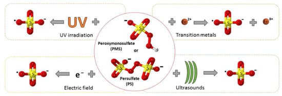 In recent years, a great effort has been made to develop more friendly strategies to overcome this environment problem [,,]. Advanced Oxidation Processes (AOPs) are known to be powerful procedures for the elimination of complex organic contaminants that the traditional processes are not capable to remove. These methods are based on the in situ production of mighty oxidants, such as hydroxyl radicals (HO•), which attack the pollutants until their mineralization []. Lately, sulfate radicals-based technology has drawn the attention of scientific community [,]. This is because the sulfate radicals (SO4•−), at neutral pH, show a reduction potential (2.5–3.1 V) higher than hydroxyl radicals (1.8–2.7 V), being more selective for oxidation. Likewise, they have a larger pH range (2.0–8.0) and considerably longer half-life period []. Sulfate radicals can be produced through activation of persulfate (S2O82−; PS) or peroxymonosulfate (HSO5−; PMS). Up to date, it has been reported in literature that several systems are able to produce the activation of these species, such as the presence of transition metals, conduction electron, UV irradiation, ultrasound, and so on [,]. Figure 1 shows some of these processes.