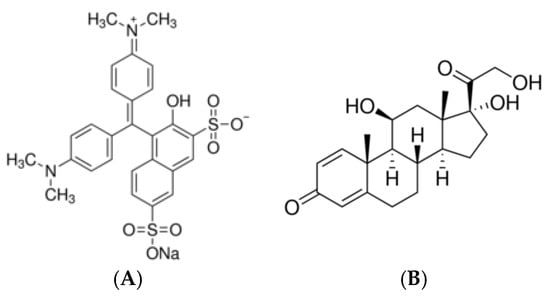 Chemical structure of (A) lissamine green and (B) prednisolone.