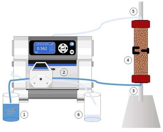 Schematic diagram of the flow system: (1) contaminated initial solution, (2) peristaltic pump, (3) input of the column, (4) column, (5) output of the column, (6) treated final solution.