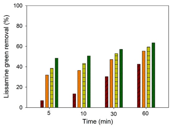 Effect of iron concentration on lissamine green removal: Fe2+ = 0 mM (diagonal lines, red), 0.1 mM (dots, orange), 0.2 mM (horizontal lines, lime), 0.3 mM (zigzag lines, green). Experimental conditions: lissamine green = 7.5 mg·L−1, PS = 1 mM.