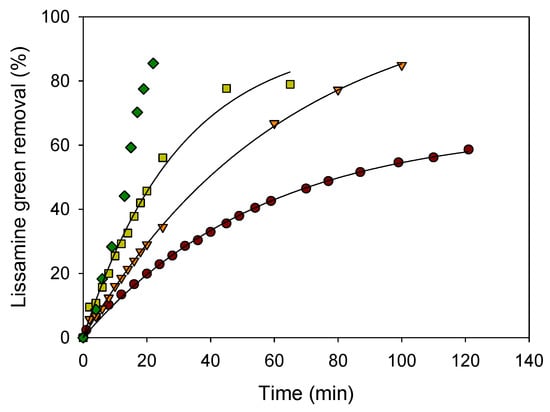In order to determine the influence of catalyst dosage on the lissamine green removal, several experiments were accomplished operating in batch mode at acidic conditions with a range of catalyst dosages from 5 to 30 g·L−1 (24–143 mM Fe2+). As can be detected in Figure 6, the removal of lissamine green achieved in the presence of catalyst has accelerated the reaction rate meaningfully, increasing the removal levels (superior than 85%) in shorter treatment time (lower than 30 min). After experiments, slight lissamine green concentration was detected in the catalyst. Hence, these results clearly indicate that lissamine green removal was due to the oxidation of persulfate with the heterogeneous catalyst designed in this study.
