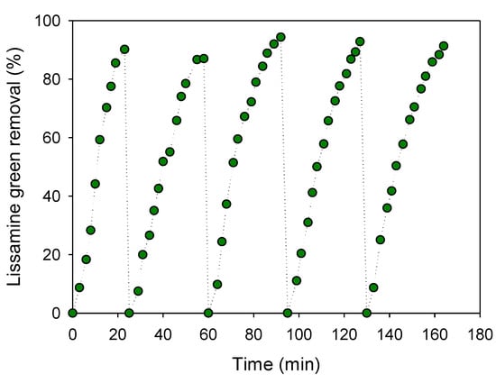Reusability of catalyst in order of lissamine green removal at larger scale. Experimental conditions: [lissamine green] = 7.5 mg·L−1, [PS] = 1 mM, [catalyst] = 30 g·L−1, volume = 1.5 L.