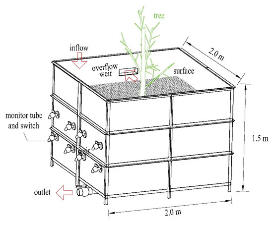 In this study, the Malus baccata and Sophora japonica (three years old) trees were planted in two tanks, and a blank test tank without a tree was also used. There was a total of five tanks used in the test. The tanks each had a length of 2.0 m, width of 2.0 m, and height of 1.5 m (Figure 1) to ensure room for natural tree root growth. Data were gathered one year after the trees were planted. Soil used in the tank was taken from a farmland in Tianjin, China. The organic content of the soil was 8.18 mg/kg, which is the mean value of three soil layers at depths of 0.35 m, 0.70 m and 1.05 m from the soil surface, as measured by the Sinomine Rock and Mineral Analysis Co., Ltd. using method NYT1121.6-2006. The soil is a loam, with a bulk density of 1.412 g/cm3 and total soil porosity of 0.46. The trunk diameters for M. baccata and S. japonica at 30 cm from soil surface were 5.15 cm and 6.46 cm, respectively. The root lengths were 23 cm for both M. baccata and S. japonica.