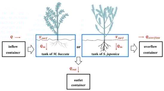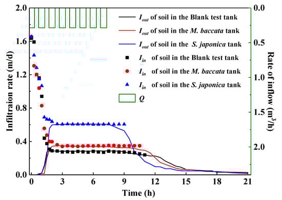The temporal variation in the soil infiltration rates at the tank soil surfaces (Iin) and at the tank soil bases (Iout) in the three different test tanks is shown in Figure 5. In all tanks, from 0–2.5 h, the soil was not saturated (Iin decreased and Iout increased). The saturation stage was reached between 2.5–7 h (Iin and Iout stabilized). Finally, the soil became unsaturated again between 7–21 h due to the termination of the water supply (Iout decreased). The similar infiltration rates at the tank soil surfaces (Iin) and at the tank soil bases (Iout) during the saturation stage indicated that the measurement of all inflow and outflow components were reliable (i.e., in good water balance, as governed by Equation (1)) during all tests. The same trends were obtained by other tanks where M. baccata and S. japonica were planted. The measured variation over time in the soil infiltration rates (Iin and Iout) provided a dataset that could be used for validation of the mathematical models that describe the entire process of infiltration through the soil. In this study, only the data obtained during the saturation stage were utilized for discussion.