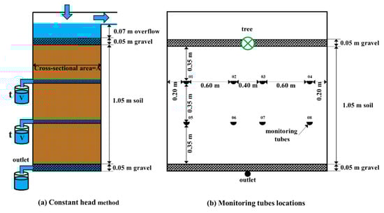 After the tank soil had been saturated with water for 3 h, the vertical variation in the infiltration rate inside of the soil was measured by the constant-head method [44] at different elevations, and water with a depth at 5 cm on the soil surface was kept to ensure the soil was under saturation conditions. Sub-horizontal monitoring tubes were set at depths of 0.35 m (four tubes) and 0.70 m (four tubes) from the soil surface (Figure 3). The monitoring tubes were made by half-round Poly Vinyl Chloride tubes (diameter = 0.05 m, length = 2.0 m), and had a slope of 0.025 to allow water drainage. A measuring vessel was attached to the end of each monitoring tube to record outflow from the tubes. Infiltration rates (I, m/d) of the soil of at depths of 0.35 m and 0.70 m were calculated using the equation below: