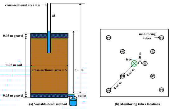 After the tank soil had been saturated with water for 3 h, the horizontal variation in the infiltration rate of the soil was measured by the variable-head method, and water with a depth at 1 cm on the soil surface was kept to ensure the soil was under saturation conditions. The bottoms of the vertical monitoring tubes were set at distances of 0.10 m (one tube), 0.65 m (four tubes), and 1.30 m (four tubes) from the tree trunk or tank center (Figure 4). The vertical monitoring tubes were made from plexiglass (internal diameter = 0.01 m, external diameter = 0.02 m, length = 2.0 m), and were inserted to a depth of 0.35 m from the soil surface. The mean infiltration rates (I, m/d) at distances of 0.10 m, 0.65 m, and 1.30 m were calculated using the equation below: