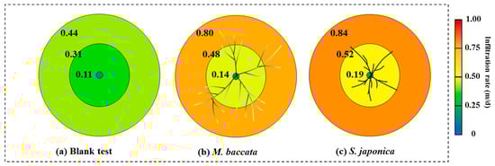 Mean soil infiltration rates at different distances from the tree trunks in the three test tanks: (a) blank test, (b) M. baccata, and (c) S. japonica.