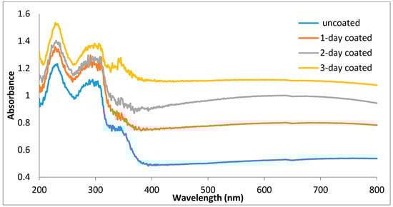 The UV-vis absorption behaviors of the uncoated and the coated membranes are plotted in Figure 4. The uncoated membrane had the lowest absorption among all the UF membranes. This is predictable because the uncoated membrane has a white smooth surface. The absorbance went higher and higher as the coating time increased. The three-day coated membrane showed the highest absorbance of the l-DOPA among the others. According to Bernsmann et al. [25] the absorption of the DOPA and dopamine-like materials do not exhibit distinctive peaks over the UV-vis range, and the increase in absorption is monotonous associated with the DOPA and dopamine deposition. This explains why l-DOPA coating did not show any distinct peak in the UV-vis range. Figure 5 illustrates how the membranes got darker in color due to l-DOPA accumulation on the membrane surface as the coating time increased.