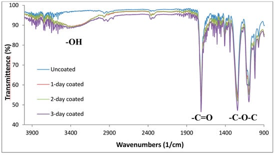 The ATR-FTIR spectra of the uncoated and the coated membranes are shown in Figure 6. Both uncoated and coated membranes had similar surface functional groups. This is expected because PES and l-DOPA are both hydrocarbon polymers and they share similar functional groups in their structure. A peak from 3000 to 3500 cm−1 indicates a free –O–H group formation on the membrane surface associated with the l-DOPA [26]. The other peaks observed are as following. The peak appearing around 1700 cm−1 corresponds to –C=O bond. The peaks appearing around 1250 and 1100 cm−1 belong to the –C–O–C bond [27]. The surface functional groups observed on the membrane surface are consistent with the previous findings and proved a successful l-DOPA coating on the membrane surface [26,27,28].