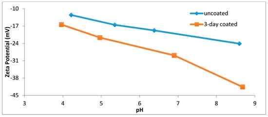 The zeta potentials of the uncoated and three-day coated membranes. Symbols represent the average of two measurements made at each pH value for each membrane sample.