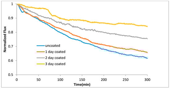 The UF experiments were conducted for 5 h to measure the flux decline of the coated and uncoated membranes due to exposure to PW. Because the observed initial flux values ranged from 42 to 127 LMH for the membranes, normalized flux was used to compare the flux behavior. The membranes exhibited different initial fluxes under identical operating conditions. The differences in observed initial flux values between the membranes were likely due to the two different batches of membranes obtained from the manufacturer. As presented in Figure 9, the uncoated membranes showed a 38.4% flux decline due to fouling over the 5 h experiment. The flux reduction was less for the coated membranes. The one-day and two-day coated membranes had 34.3% and 24.6% flux decline, respectively. The three-day coated membrane had the highest fouling resistance during the experiments. The flux decline due to fouling was only 16%.