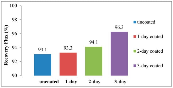 The UF membranes were cleaned by backwashing with DI water to test the flux recovery after fouling. The results are illustrated in Figure 10. It was observed that after 30 min of cleaning, the uncoated membrane regained 93.1% of its initial flux while the same was 96.3% for the three-day coated membrane. The coating helped the membrane to achieve a higher flux recovery. There was 3.2% improvement for the three-day coated membrane. This indicated that the improvement in hydrophilicity after l-DOPA coating helped the membranes to become more resistant against fouling. It is likely that the particles were more loosely attached to the surface of the coated membranes. Therefore, those particles were washed off relatively easily during the cleaning. It can also be concluded that the cleaning with water only was sufficient to achieve a higher flux recovery for coated membranes due to the reversible nature of the fouling particles on the surface. This will likely reduce the need for chemical cleaning and extend the operational life of the membranes.
